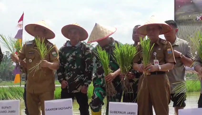 Dobrak.id- Muaro Jambi, Bupati Muaro Jambi Bambang Bayu Suseno Dan Wakil Bupati Muaro Jambi Junaidi Mahir,  Mendampingi Wakil Gubernur Jambi Abdullah Sani Dalam Kegiatan Penanaman Padi Serentak Se Provinsi Jambi.  Bbs Menyebut Pemkab  Muaro Jambi  Mendukung Penuh Kegiatan Swasembada Pangan Nasional Tersebut.