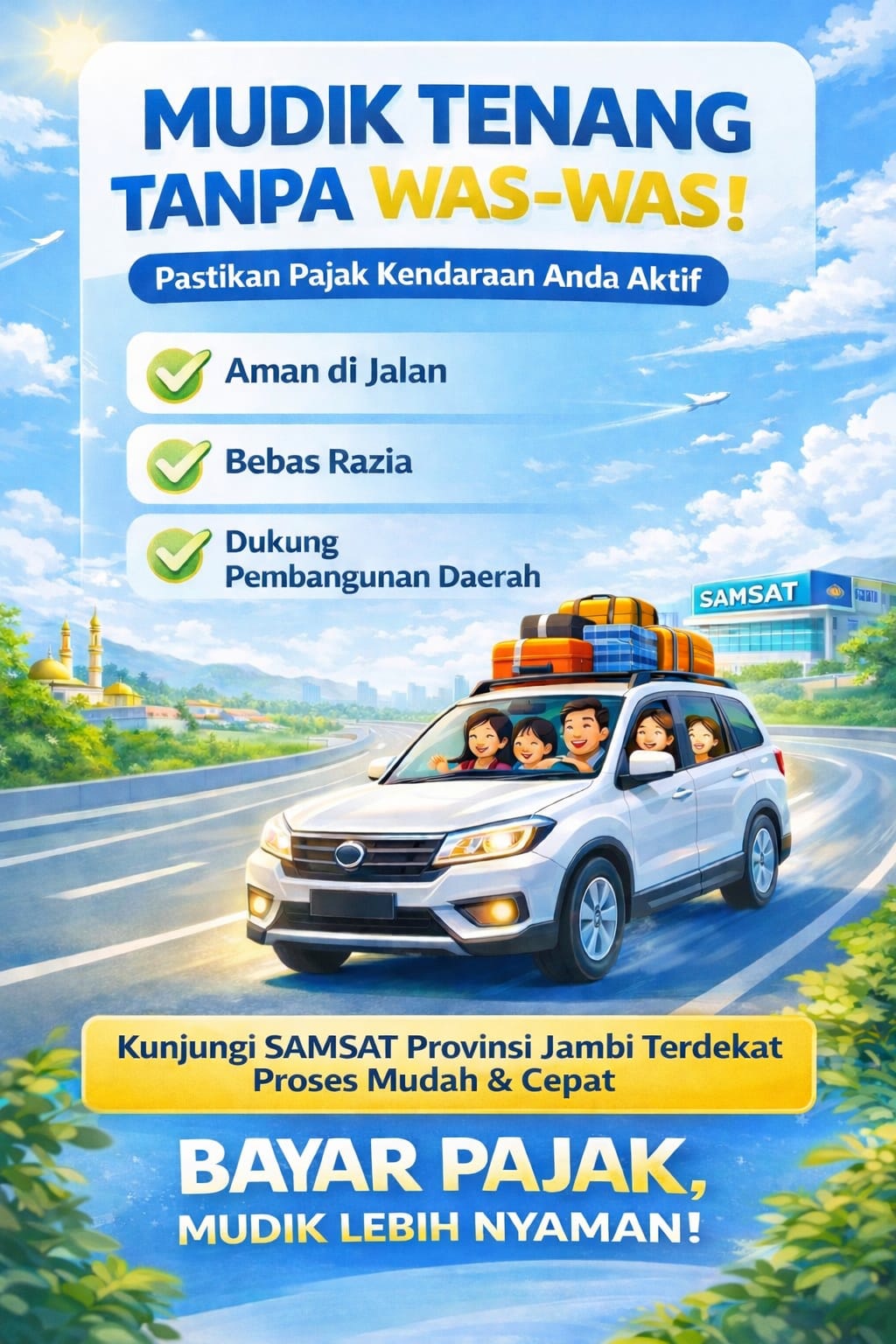 Dobrak.id – Kota Jambi, Menjelang musim mudik, masyarakat diimbau untuk memastikan kendaraan yang digunakan telah memenuhi seluruh persyaratan administrasi, salah satunya dengan membayar pajak kendaraan tepat waktu. Dengan pajak kendaraan yang aktif, perjalanan mudik menjadi lebih tenang, aman, dan bebas dari kekhawatiran saat berkendara di jalan.